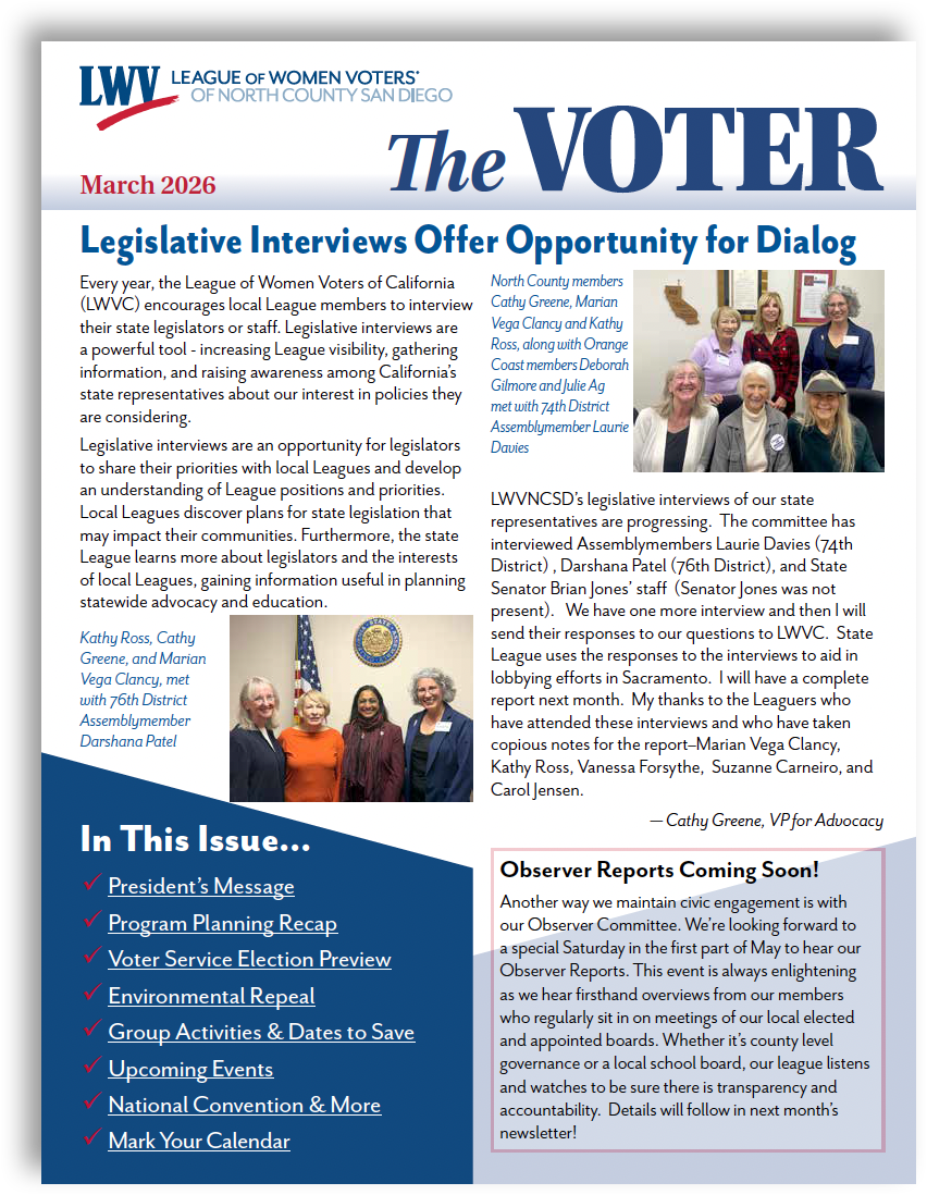 The League of Women Voters of North County San Diego is a 501(c)(3) organization under the Internal Revenue Code. Contributions are tax-deductible to the full extent permissible under law. Our federal tax ID is 95-3389795